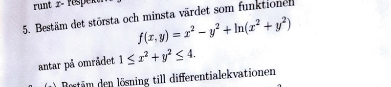 Bestäm största och minsta värde till funktionen som f(x,y) antar på området