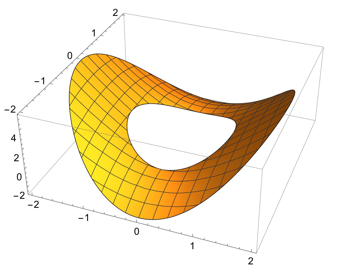 Denna funktion är växande m.a.p. r varför den blir mera och mera "extrem" i sin "vågning" desto längre från origo du kommer. "Vågningen" skapas av cos(2t). Därför inträffar max/min på randen där r=2.