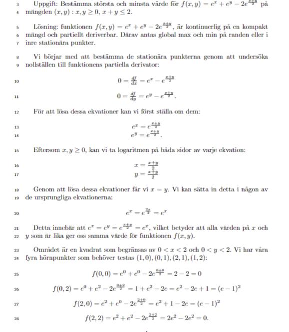 f(x,y)= ex+ey-2e(x+y)/2, på mängden {(x,y): x,y ≥ 0, x+y ≤ 2}.