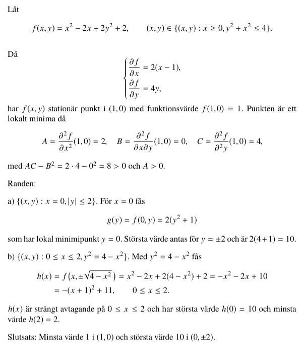 Bestäm största och minsta värdet till f(x,y)=x^2-2x+2y^2+2 på området (x,y): x>=0, x^2+y^2<=4.