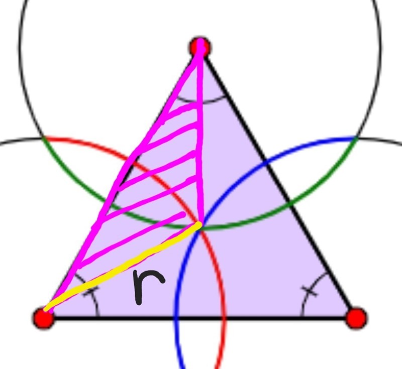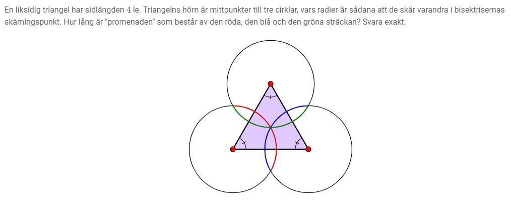 Ett sätt är att först beräkna den liksidiga triangelns area och att sedan ställa upp ett uttryck för arean av nedanstående triangel. Detta uttryck har då endast radien r som obekant storhet.