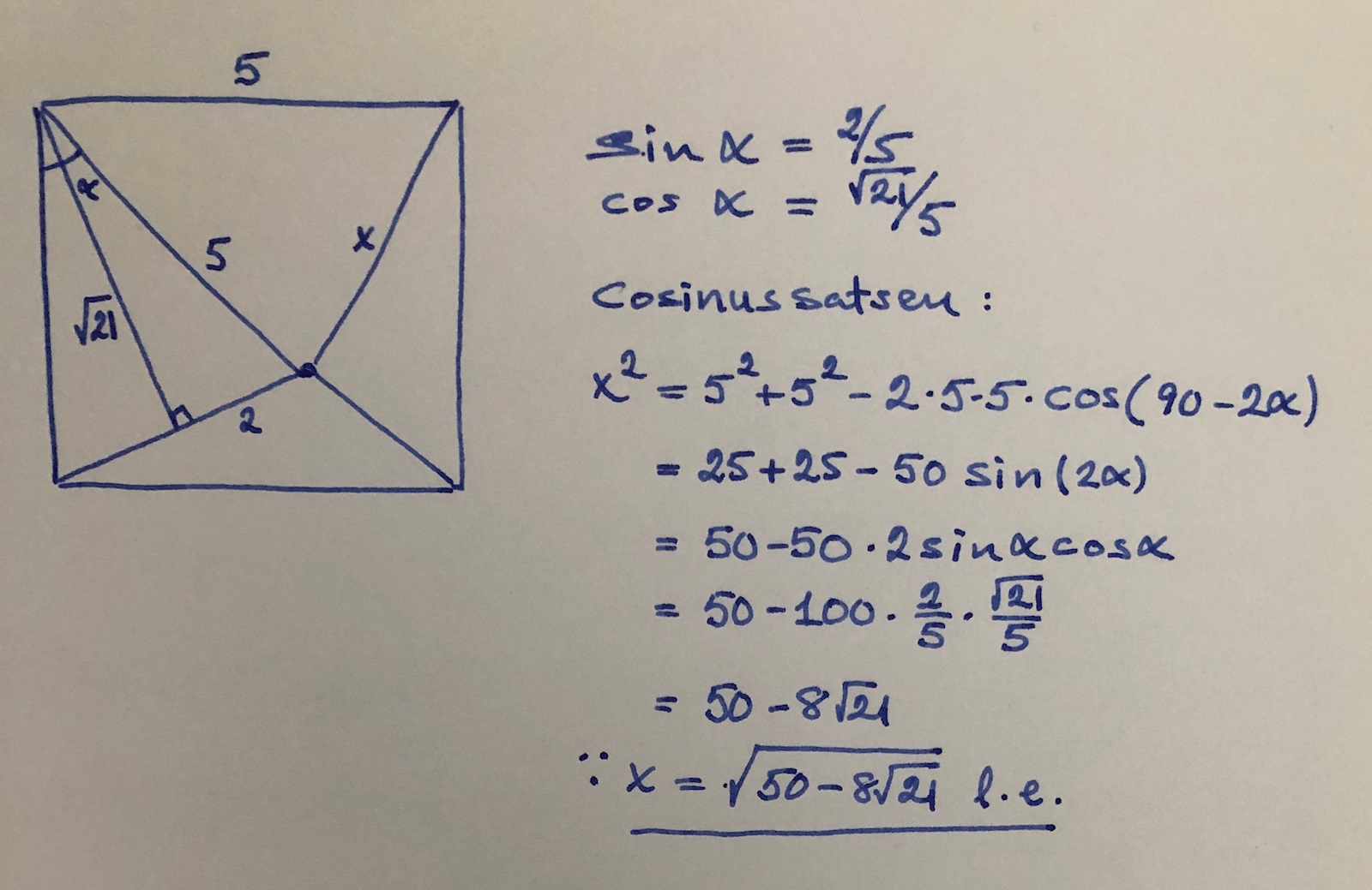 Bestäm sträckan x i nedanstående kvadrat då kvadratens sida är 5,00cm. Mätning godtas ej.