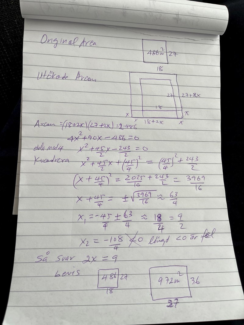 En rektangulär gräsmatta har måtten 18m x 27m. Den utökas runt om med en lika bred strimma överallt. Bestäm strimmans bredd så att arean fördubblas.