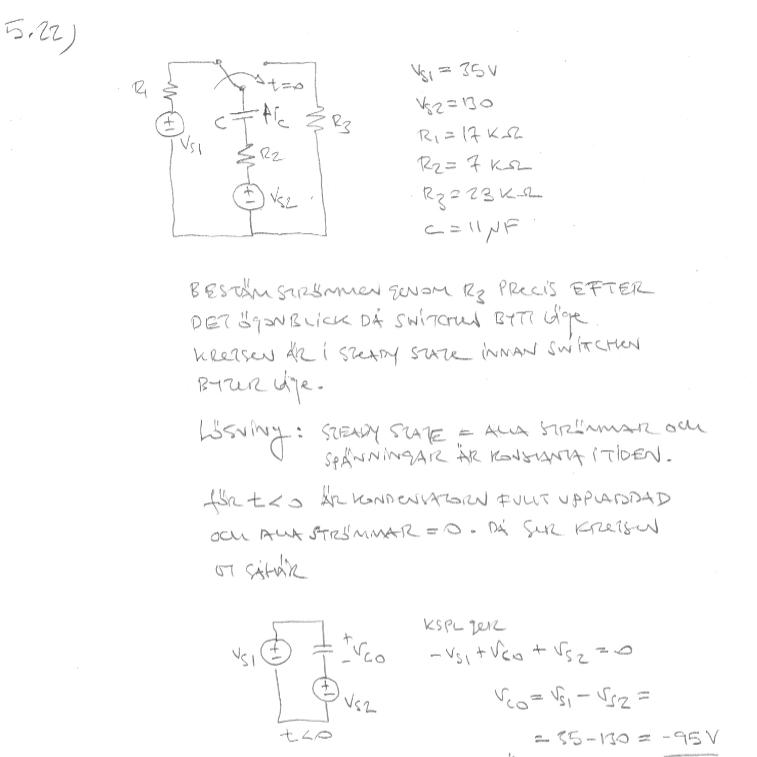 Bestäm strömmen genom R3 just efter switchen är påslagen vid t=0+ (Elektroteknik)