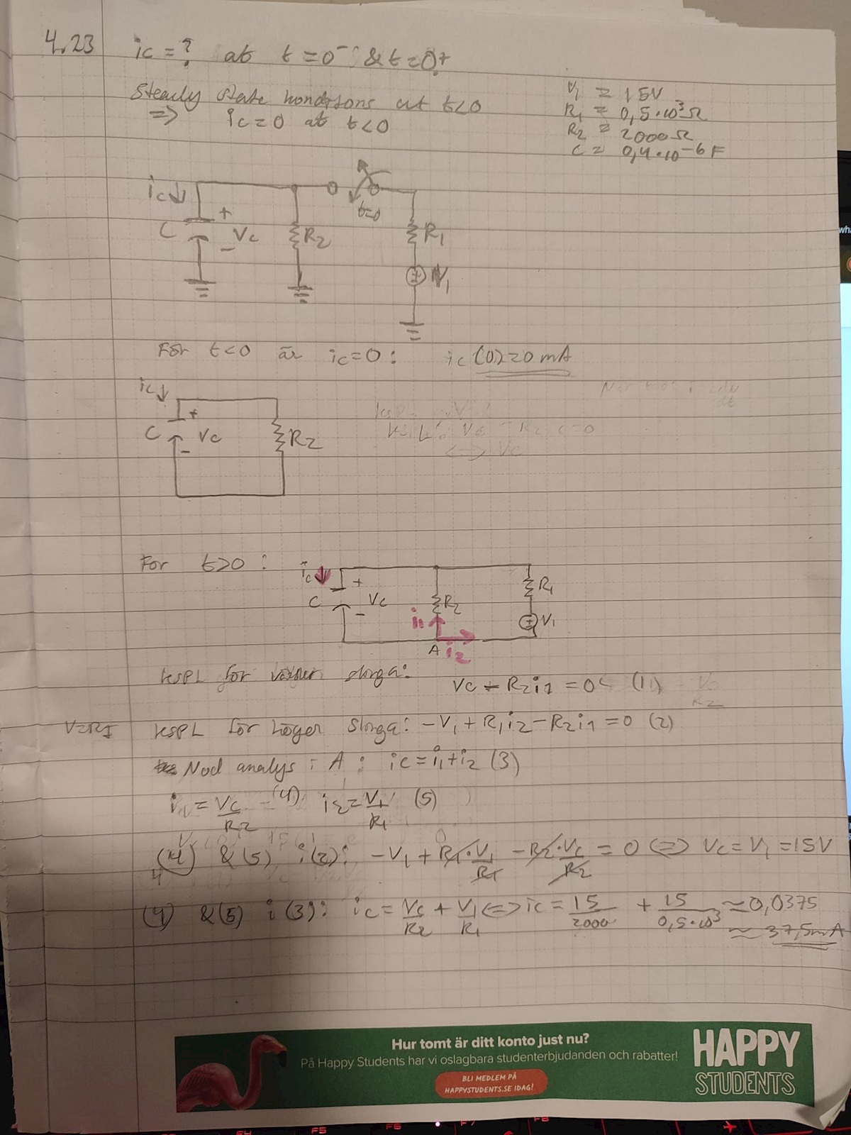 För t=0- så ska man förutsätta steady-state. Det innebär att kondensatorn är urladdad genom R2, dvs Vc=0 och därmed ic=0. Det verkar du ha insett, eller hur?
