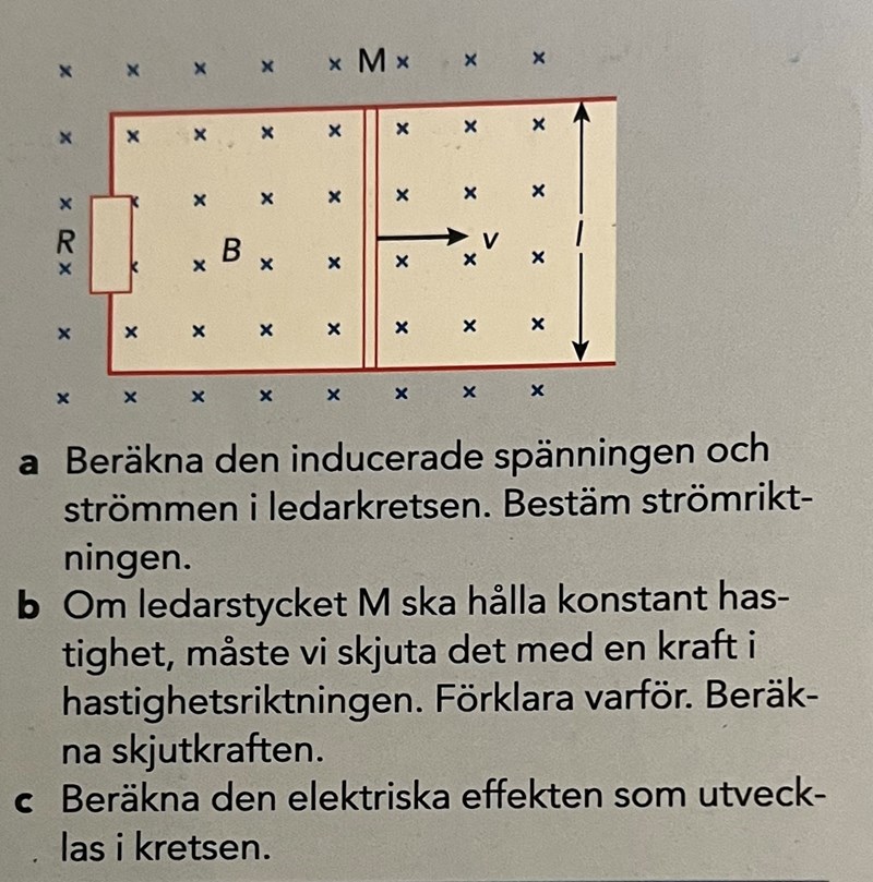 Jag håller på med uppgift a som du kan se nedan, och hade gärna velat ha hjälp med att bestäma strömriktningen? Jag förstår att jag ska använda mig av högerhandsregeln (jag använder tummen som F, pekfingret som I och långfingret som B). Då får jag att B pekar inåt mot pappret (pga kryssen ”x” som visar att B går inåt) och pekfingret pekar åt höger då v på bilden pekar åt höger, och då får jag att tummen, F, pekar upåt. Men jag förstår att det är den andra högerhandsregeln jag ska använda mig av, men jag förstår inte riktigt hur. När jag sätter tummen åt höger (samma riktning som I/v) och vrider övriga fingrar så får jag att strömmen går medurs, men i facit står det att den ska gå moturs…Är det fel att jag har satt pekfingret som v åt höger? Kanske jag ska sätta det rakt uppåt som den svarta pilen markerar till höger om bilden?
