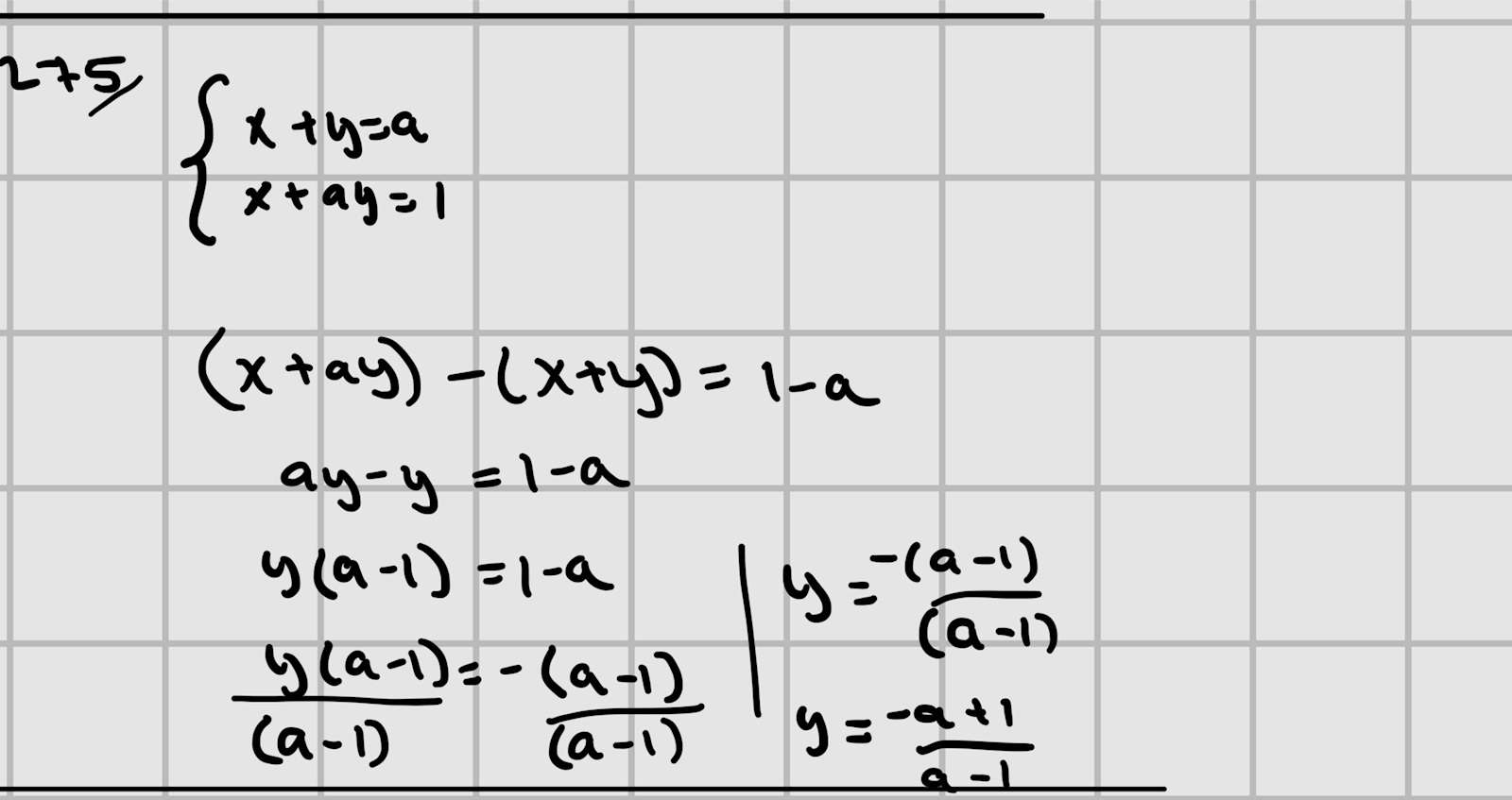 För fallet a = 1 så ser vi att båda ekvationerna kan skrivas y = -x+1. Det är alltså två linjer som sammanfaller och de har alltså oändligt många gemensamma punkter.