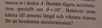 Jag fick a=gtantheta där man kan stoppa in theta=10 grader . Det ser inte ut som att man behöver känna till armens längd och viktens massa för att bestämma a.