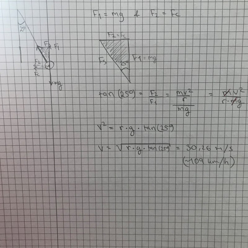 Bengt sitter i ett tåg som kör in i en kurva med radien 200m. Han håller upp en sytråd med en kula med vinkeln med lodlinjen (se figur). Bestäm tågets hastighet.