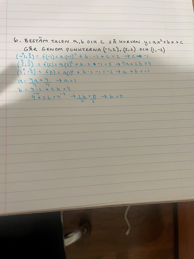 Svaret kommer ge oss vad variablerna motsvarar och ge oss lösningen för att kurvan y=ax2+bx+cy = ax^2 + bx + c går genom punkterna (-1,2)(-1,2), (2,5)(2,5) och (1,-2)(1,-2).