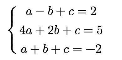 Invalid Latex\begin{align}<br />a - b + c &= 2 \\<br />4a + 2b + c &= 5 \\<br />a + b + c &= -2<br />\end{align}