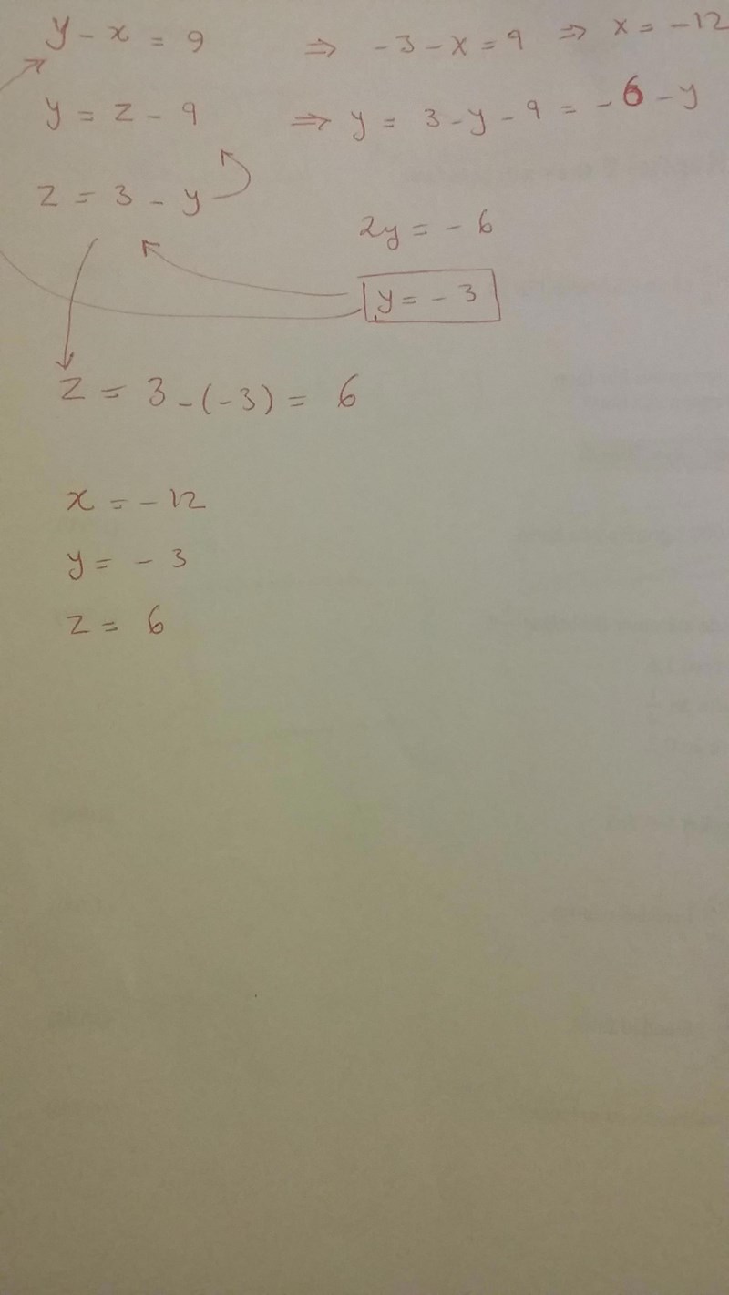 Men det skulle lika gärna kunna tolkas som 3 - y = z, z - 9 = y och y - x = 9.