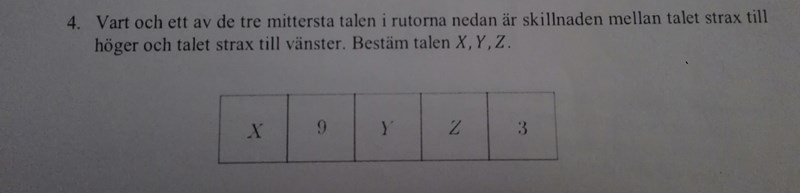 Jag försökte lösa genom att skriva en ekvation för de men y = x -3 och z =9-y säger mig inte så mycket :/ kan man ens lösa det så här? Själv tänkte jag på att y måste vara under 9 för annars blir det negativ, det kan inte vara 7 för att då blir skillnaden 2 och 7-2 = 5 inte 3 så jag testade med 6 och då stämde det 9-6 = 3