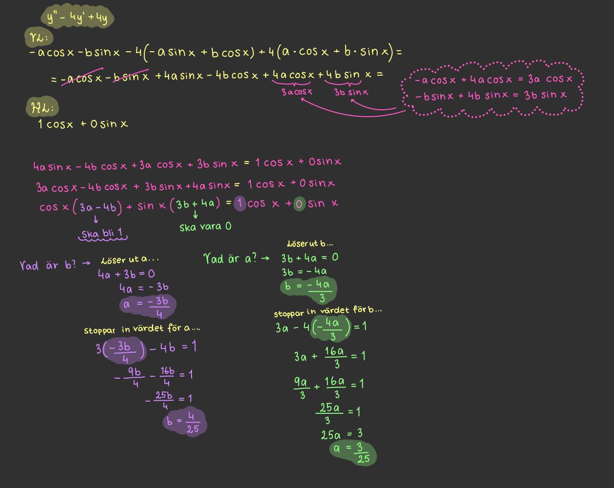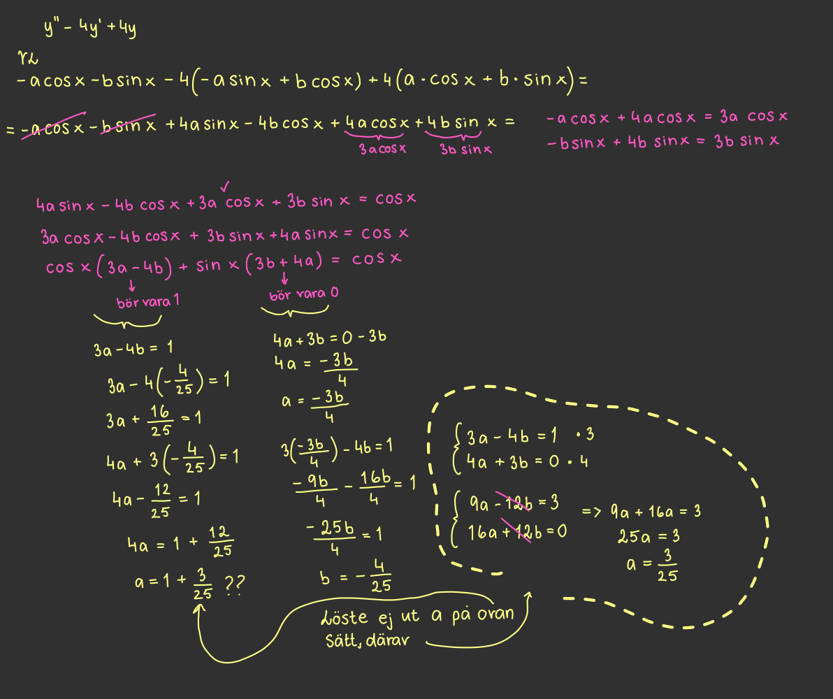 När du börjar skriva med gult nedanför det rosa: Jag är med på att du sätter 3a-4b = 1, men 4a+3b borde bli 0, inte -3b. Man skulle ju kunna skriva HL i diffekvationen som 1.cos(x) + 0.sin(x).