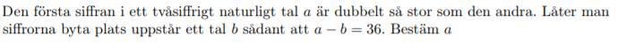 Annars kan man konstatera att det etvåsiffriga talet kan skrivas som 21a och "baklängestalet" som 12a, och så vet vi att 21a-12a =36. Lös ekvationen. OBS! När du har löst ekvationen är du inte färdig.