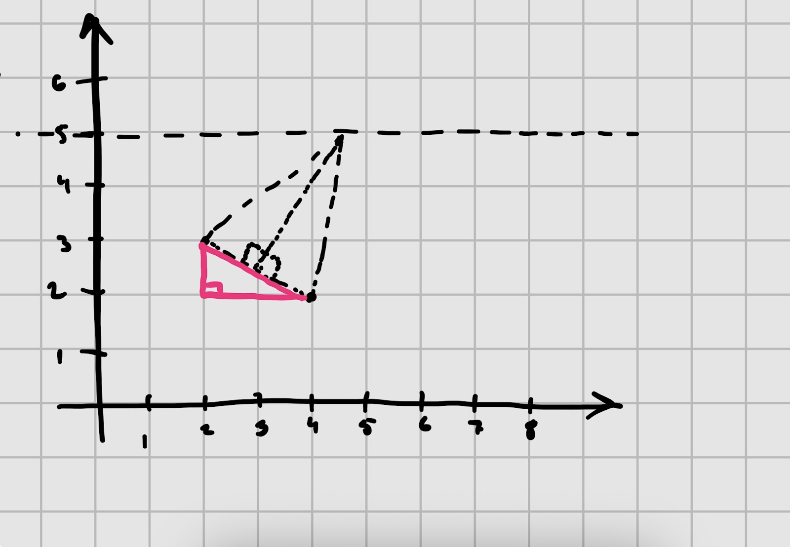 Jag tänker att man kan se det som en likbent triangel när avståndet mellan de två punkterna vi har båda koordinaterna till är basen. Basen går att räkna ut genom Pythagoras sats (se den Rosa rätvinklia triangeln) Jag har gjort detta än, men bara av anledningen att trots att jag bara kan basen blir det lite svårt att räkna ut sidorna eller höjden för att sedan räkan ut sidorna. Är det tänkt att man ska skapa någon ekvation utifrån detta sedan?