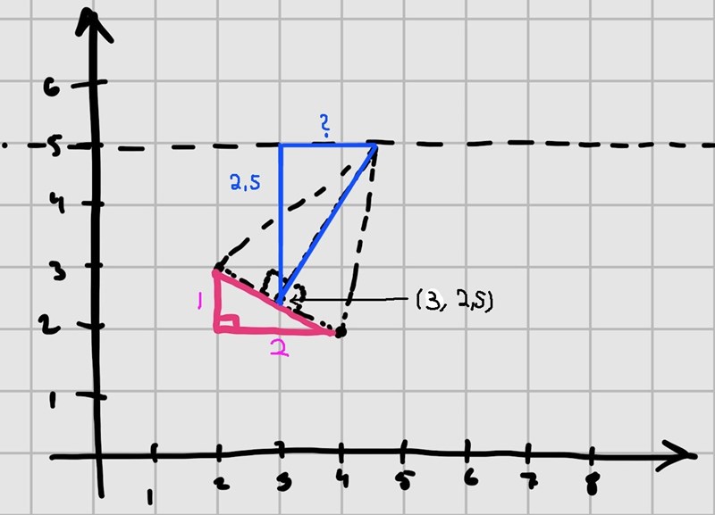 Diagrammet är bra. Prova att göra en formel för linjen som går från mitten av hypotenusan för din triangel och snett upp mot y=5. Var skär den linjen y=5?