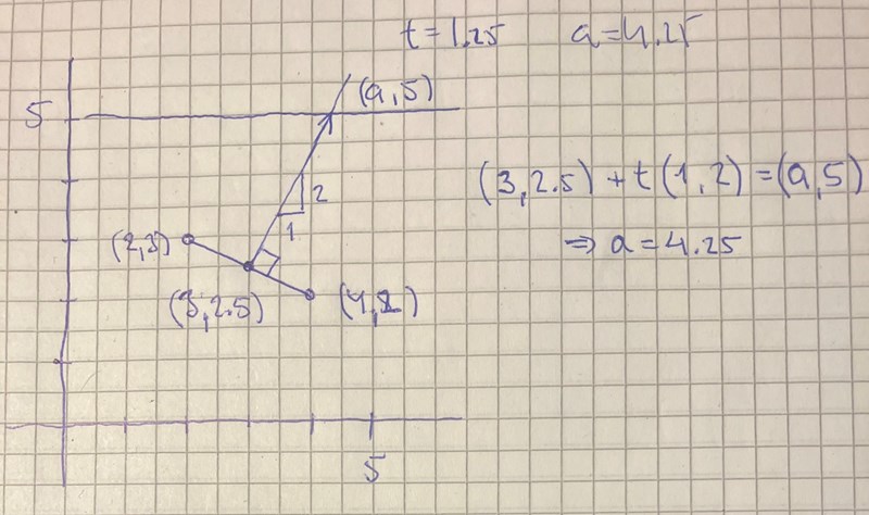 Ett annat sätt är att ställa upp uttryck för avstånden från (a,5) till de båda punkterna, och sätta dem lika. Det kanske är enklare.