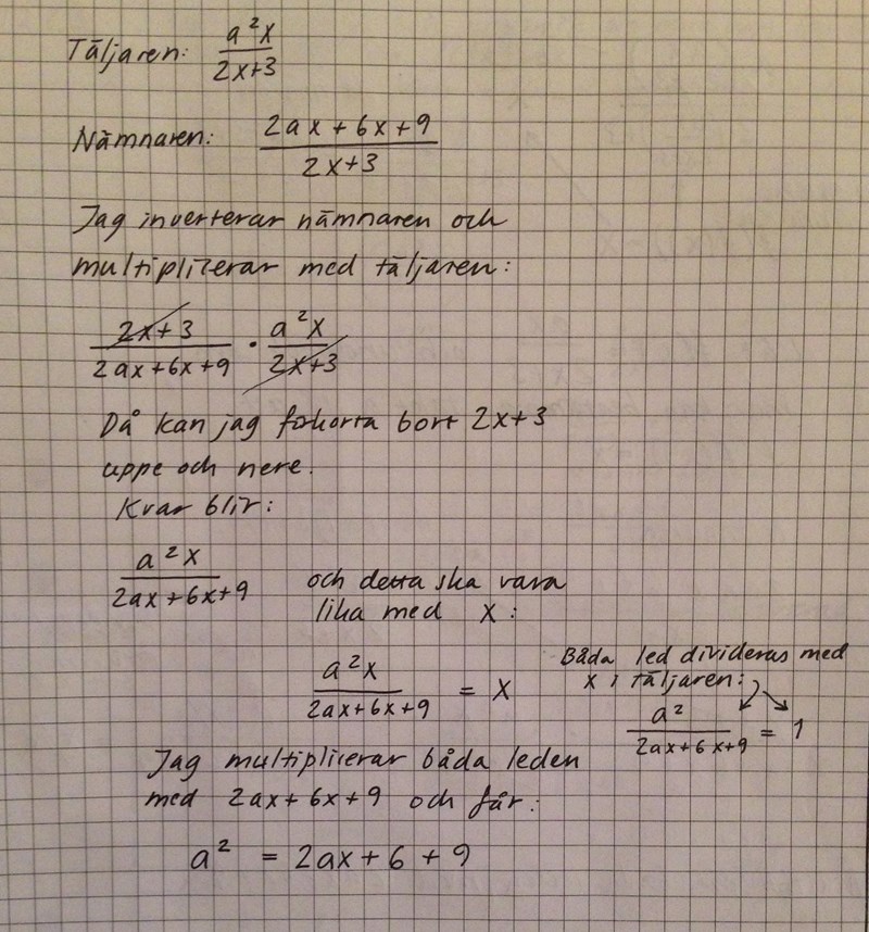 Sedan bröt du ut x i högerledet. Det skulle jag inte kommit på att göra utan din hjälp och jag är ännu inte helt insatt i hur det kommer sig att man kan göra så. Jag bara lär mig att det är så, så länge.