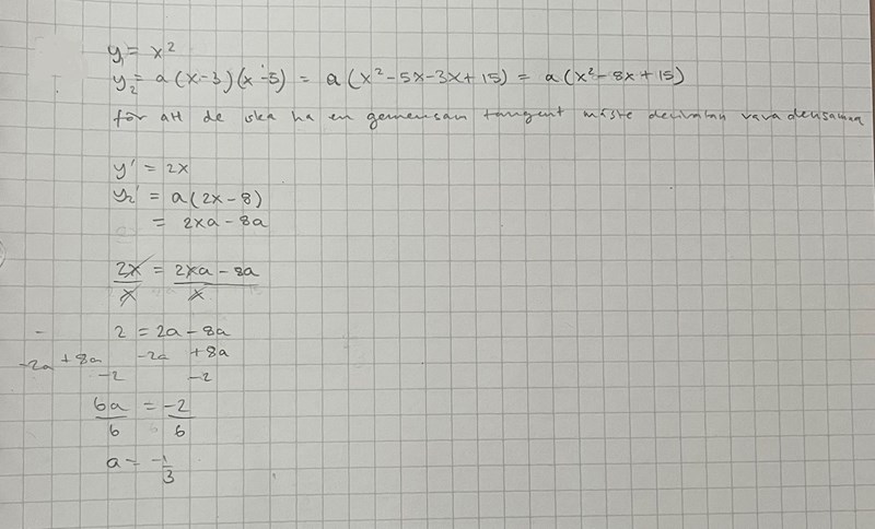 Jag håller på med denna uppgift som du kan se nedan. Nedan kan du se hur jag har försökt lösa uppgiften. Det jag försökta göra var att derivera båda funktionerna och sedan ställa dem mot varandra så. Jag kommer fram till att a = -1/3 men det är fel enligt facit. Jag undrar om jag först och främst har tänkt rätt och använt mig av rätt metod? Om ja, vad för fel är det då jag gör som ger mig ett inkorrekt svar? Om nej, varför fungerar inte min metod och hur ska jag lösa uppgiften istället?