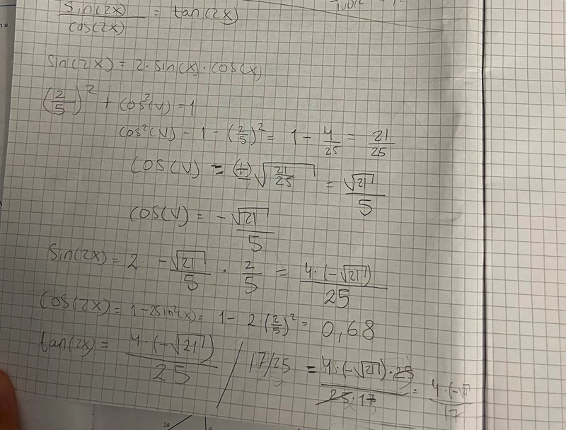 bestäm tan(2x) då sin(x) = 2/5 och 90 < x < 180