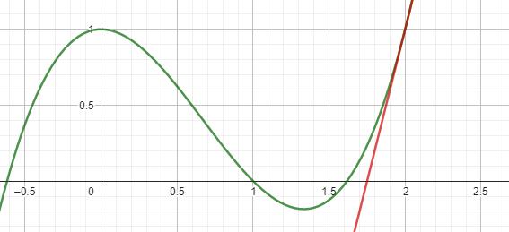 Det gäller att hitta tangenten till kurvan i punkten x=2.