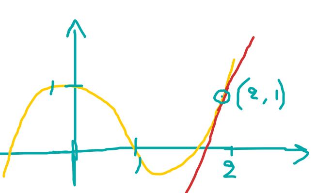 2) tangenten vidrör punkten (2,1), alltså när x=2 så är y=1.