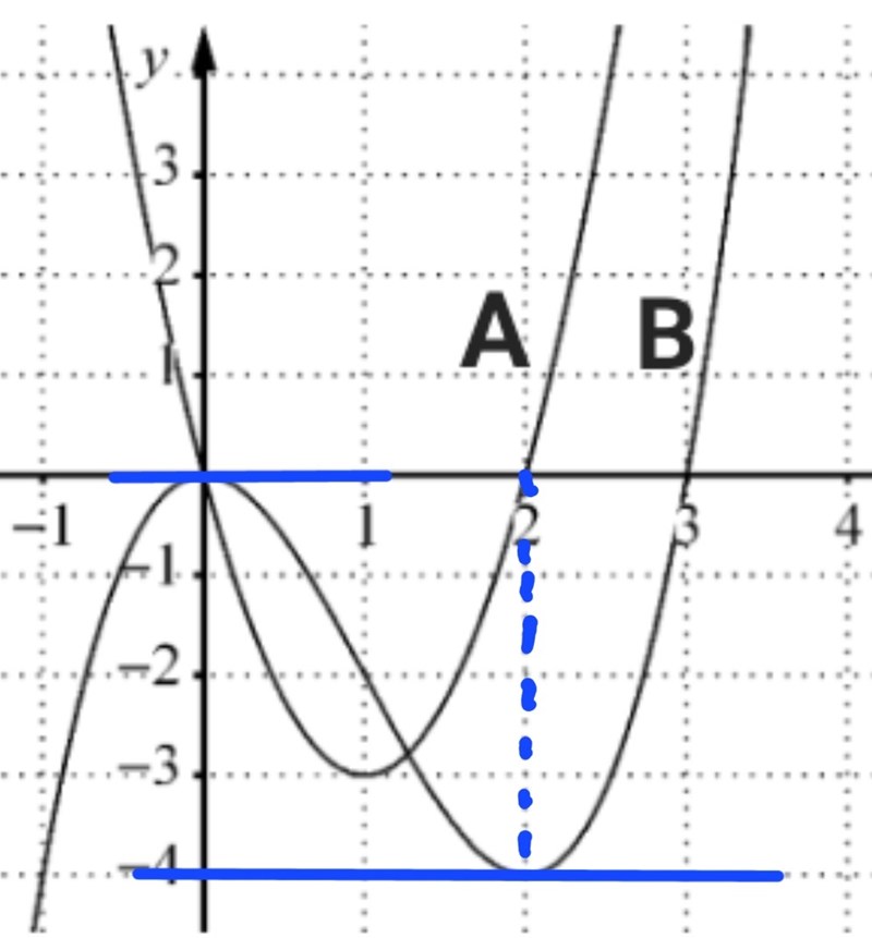 Därför är graf A derivatan y = f'(x) och graf B är y = f(x).