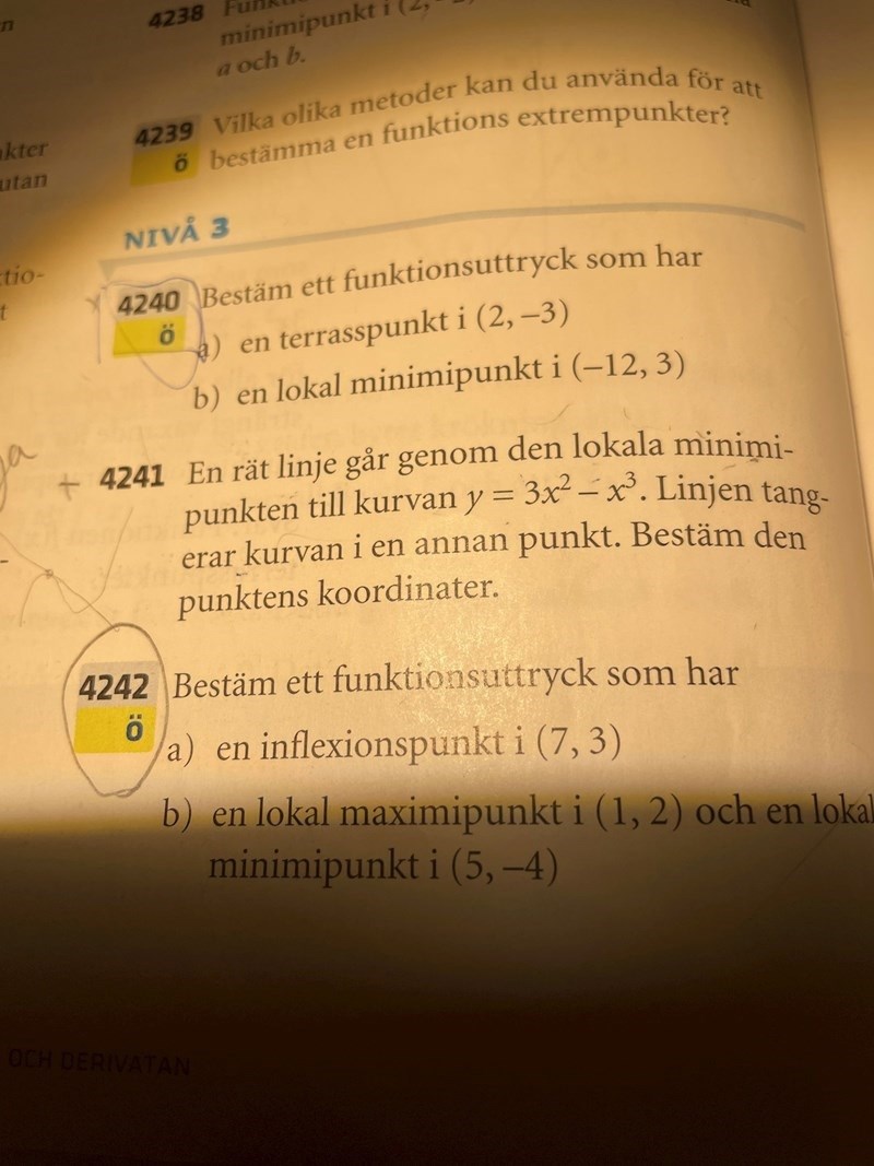 Den räta linjen går genom origo och tangerar kurvan på ett annat ställe.