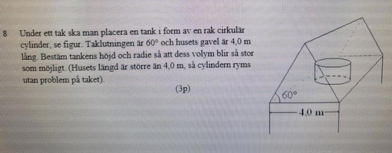 Bestäm tankens höjd och radie så att dess volym blir så stor som möjligt.