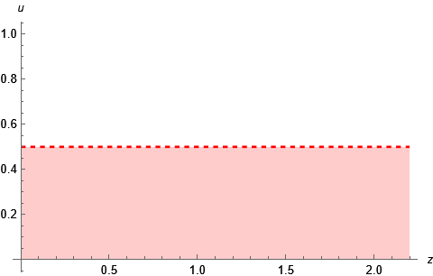 Funktionen är nollskild då ligger i intervallet 0 till 1/2, oavsett vilket värde har. Vi kan illustrera området med en zu-graf: