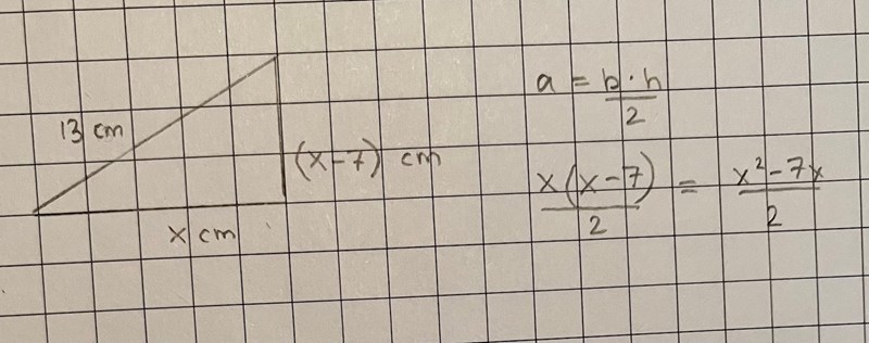 En rätvinklig triangel har en katet som är 7 cm kortare än den andra kateten, och en hypotenusa som är 13 cm. Rita figur och bestäm triangelns area.