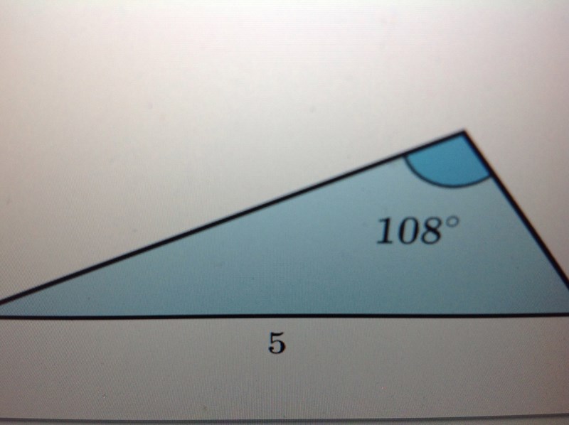 5*h/2=3,8cm^2 5h=7,6 h=1,52 sin(108)*a=1,52 a=1,64 6-1,64=4,36 svar: 1,64cm och 4,36cm?