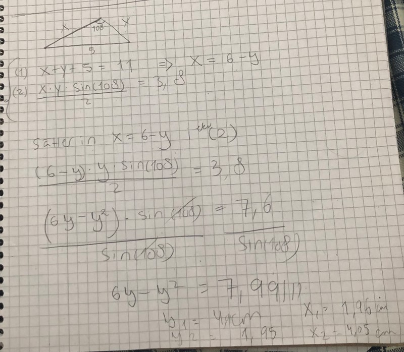 Bestäm triangelns okända sidor om triangelns omkrets är 11cm och dess area är 3.8cm^2.