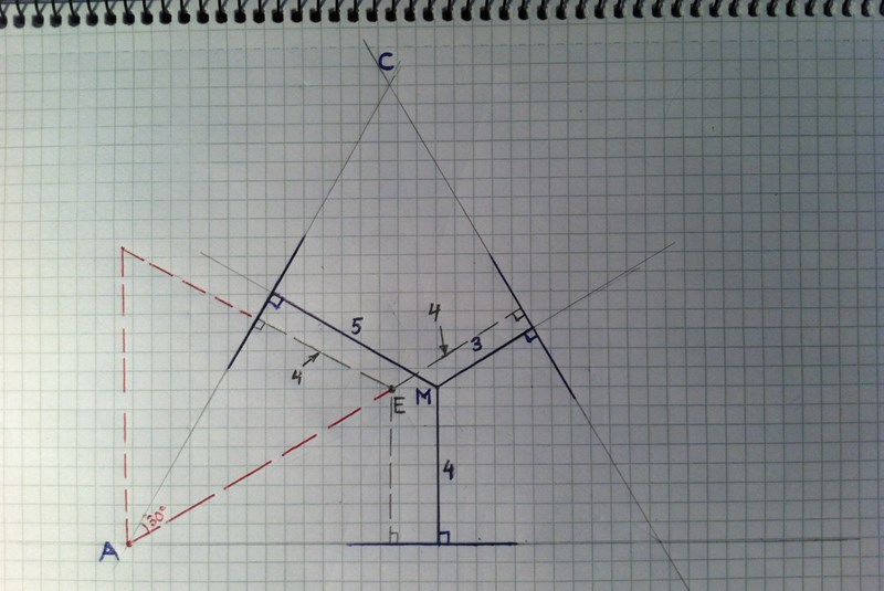 Då E är mittpunkten kan jag dra linjen E-A och sätta ut vinkeln 30 grader vid A.