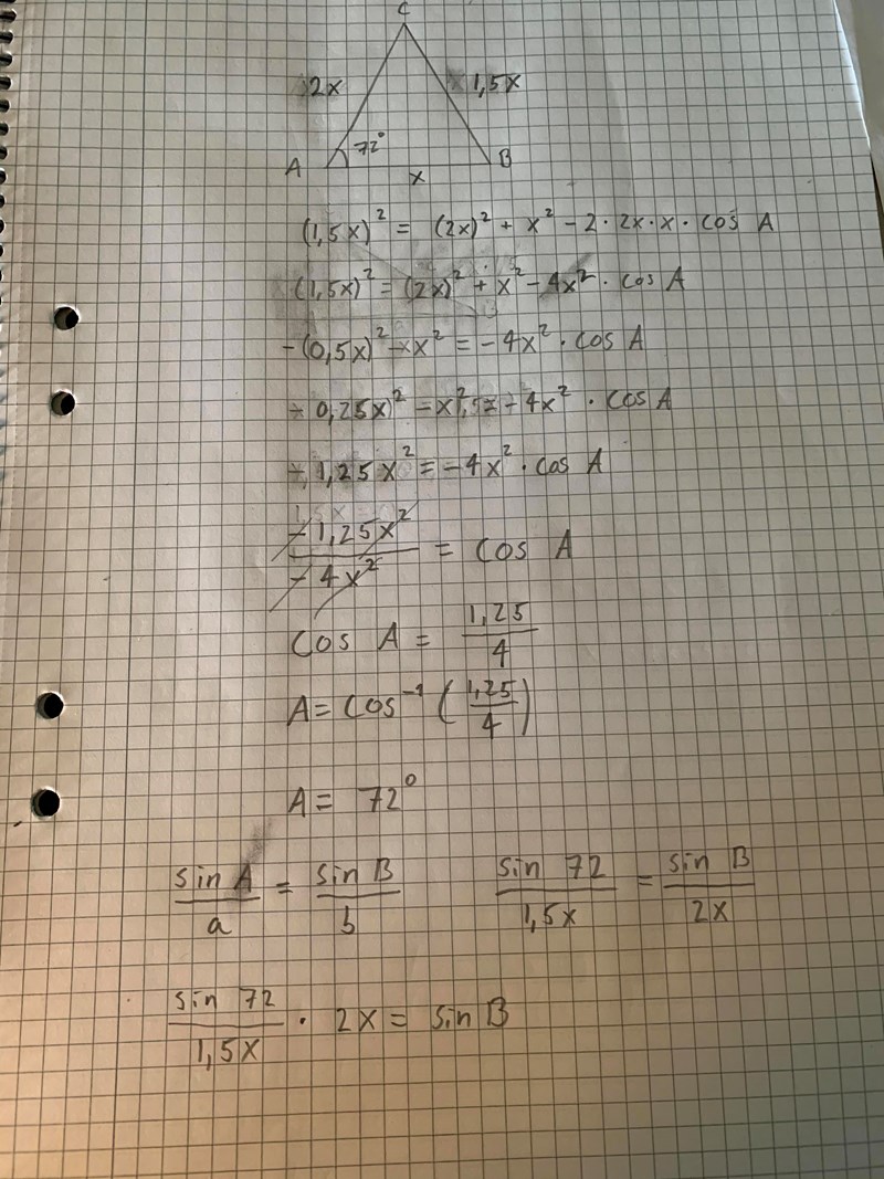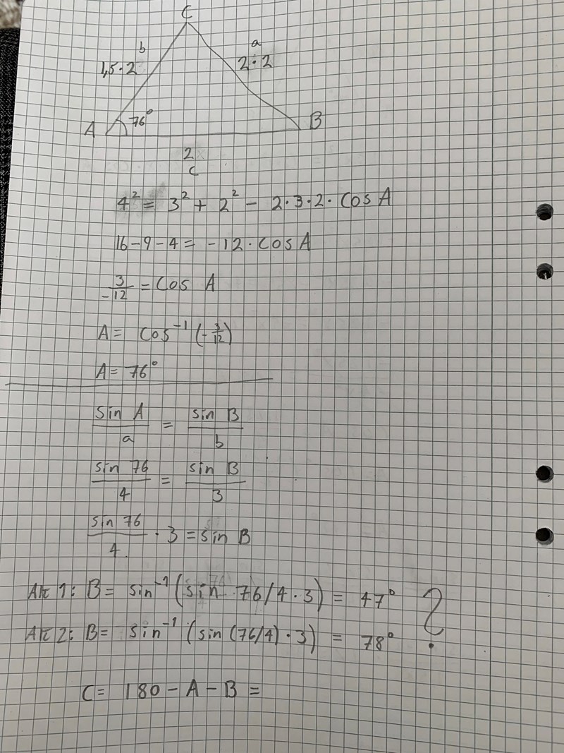 jag började med cosinussatsen för att bestämma vinkel A som kändes bra. Men sedan gjorde jag ett försök med sinussatsem för att bestämma vinkel B men det känns fel... sista vinkel C tänkte jag bara ta reda på med vinkelsumman.