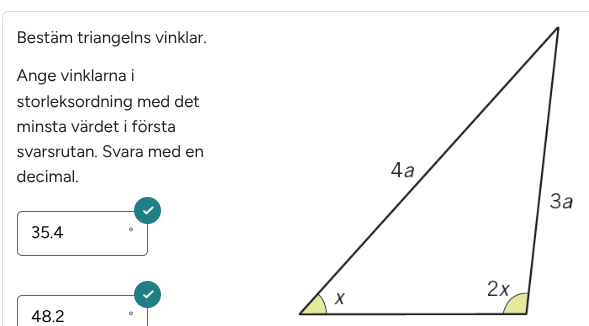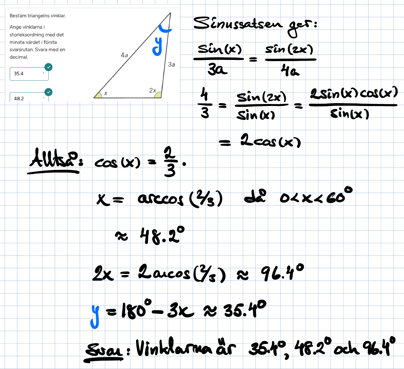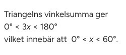 Hej! När jag skulle lösa denna uppgift kikade jag i facit och förstod inte detta steg. Hur ligger vinkelsumman i ett intervall? Är den inte alltid = 180 grader? Tack på förhand!