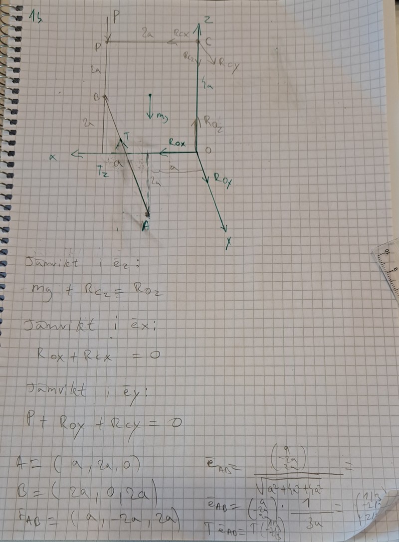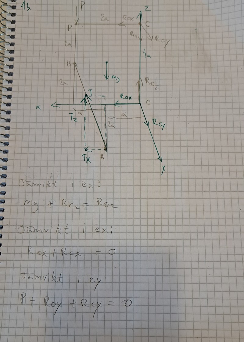 Jag har kört fast i min friläggning av detta problem samt hur jag ska formulera ett moment i 3D då jag bara kom på att det finns RCx , RCy ,P (givet) , mg och den där spännkraften TAB.