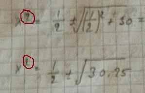 Exponenterna jag har rödmarkerat ska inte vara där, utan det ska bara stå "x = 1/2 +- ....." utan kvadraten.