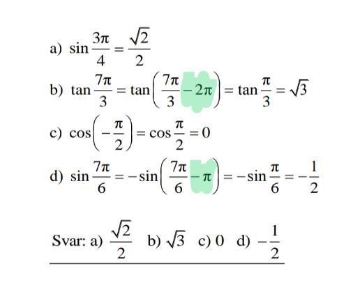 Om du undrar över det som du har markerat så har man i b) utnyttjat att tangens har perioden 2. Det betyder att den upprepar sig och hamnar på samma värde efter 2. I d) har de utnyttjat att sinus är en udda funktion (d.v.s. ) och att den har perioden 2, vilket betyder att när du drar ifrån en halv period så hamnar du på samma värde men med omvänt tecken. Därmed inte sagt att du behöver göra precis likadant som de har gjort.