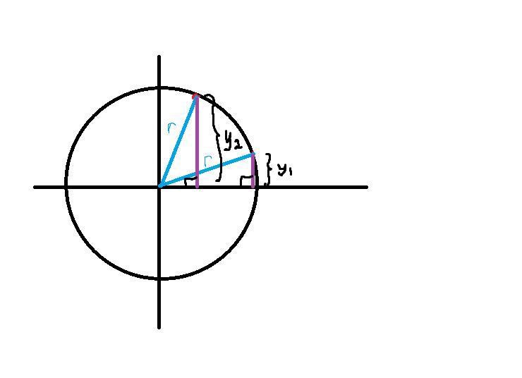 Antag att radien r på cirkeln är fixt. Om du drar punkten längs med cirkelns rand så kommer längden från origo till punkten på randen att ha samma längd, dvs r. Om du kan tänka dig inskrivna rätvinkliga trianglar som på bilden nedan så ser du att höjden y beror på både r och x. Men eftersom r var fixerad så är det bara x (motsvarar den andra kateten) som förändras.