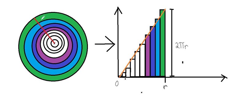 Ett alternativt sätt för att bestämma arean hos en cirkel är att utnyttja att vi vet hur cirkelns omkrets är definierad dvs samt delar in cirkeln i små segment som på bilden. (Säg till ifall du vill ha en förklaring)