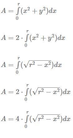 Min första tanke är att använda Pythagoras sats för att bestämma y eftersom att det kommer att ge formeln för hela arean i det första området (Skriv gärna ifall det är fel tankesätt) vilket ger y^2=sqrt(r^2-x^2). Integrations gränserna blir 0 och r för ifall hela området ska täckas måste den börja med noll och sluta vid r i x-axeln. Arean blir endast för området i den första kvadranten och därför multiplicerar jag integralen med 4. Integralen blir . Fast är lite osäker på ifall mitt tankesätt för de olika processerna är korrekta samt även lösningen och detta var en uppgift jag hitta på nätet utan facit