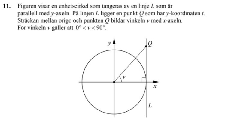 Varför skulle det vara fel om jag antog att 1=radien (för enhetcirklar har alltid radien 1) och höjden=t. Och på så vis skulle jag kunna sätta upp tan v=t/1