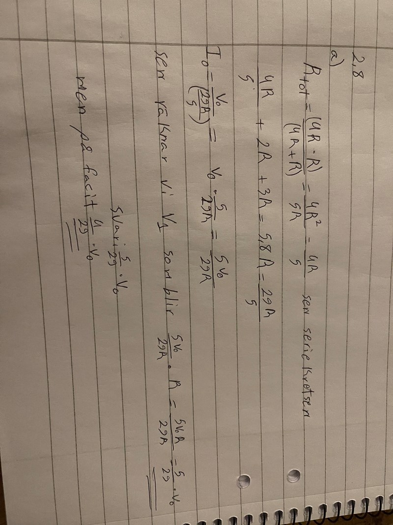 Jag har försökt lösa uppgift 2.8 a men jag har fått V1=5/29 gånger Vo men i facit står 4/29 gånger Vo. Jag undrar om någon kan förklara vad har jag gjort för fel.