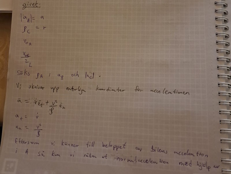 jag försökte lösa på det här sättet men får inte rätt uttryck för rho_A enligt facit och vi vet inte farten i punkten A heller. Misstänker att man ska uttrycka okända farten med längden