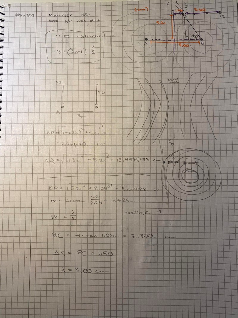 Jag gav uppgiften ett försök genom att anta den vertikala linjen som centralmax och därmed P ligga på första nodlinjen (med argumentet att det lät rimligt...). Därefter placerade jag en punkt C på centralmax som ligger i linje (vinkelrätt) med B och P. Därefter körde jag trigonometri. Jag förstår dock att detta är fel väg att gå, men kan inte komma fram till hur jag löser den mer "rätt". Jag har problem med beräkning av den horisontella sträckan PQ eftersom den inte ligger vinkelrätt mot vågorna...