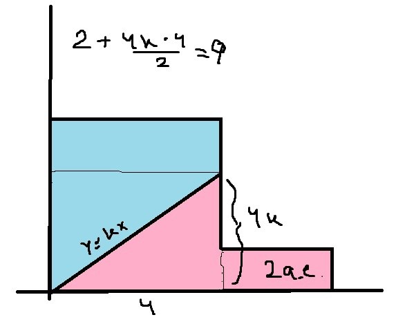 okej, så vi vet att rektangeln på slutet har arean 2, vi vet att basen på triangeln är konstant 4, höjden på den beror på k. Sättet vi allt det lika med 9 borde det bli rätt svar annars ger jag upp på livet