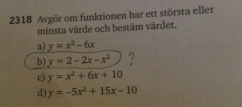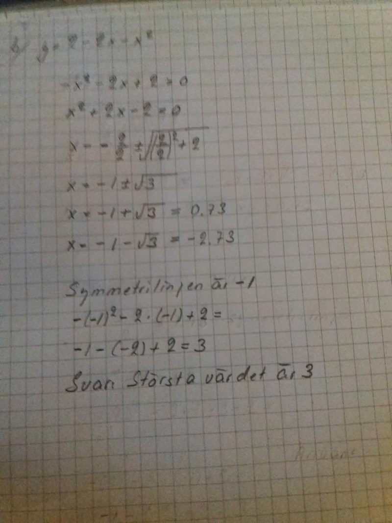 Vi ser nu direkt att det största värdet fås då kvadrattermen blir noll, vilket den blir för . Största värdet blir då lika med .