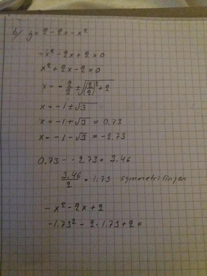 Du gör helt rätt fram till dess att du skall räkna ut symmetrilinjen. där borde du ha (0,73 + (-2,73))/2. Då får du en helt annan och korrekt symmetrilinje.